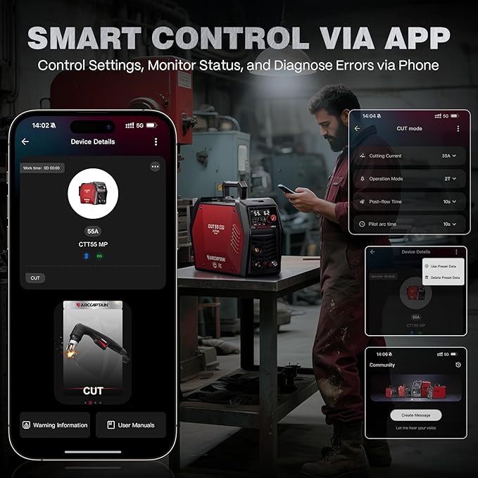 - [SMART APP CONTROL] Built-in APP connectivity allows you to control and monitor your CUT55 MP remotely via your smartphone. You can adjust cutting current, monitor air pressure, receive error alerts, and even track work status in real time. With APP control, you can increase efficiency, reduce downtime, and improve operational safety.