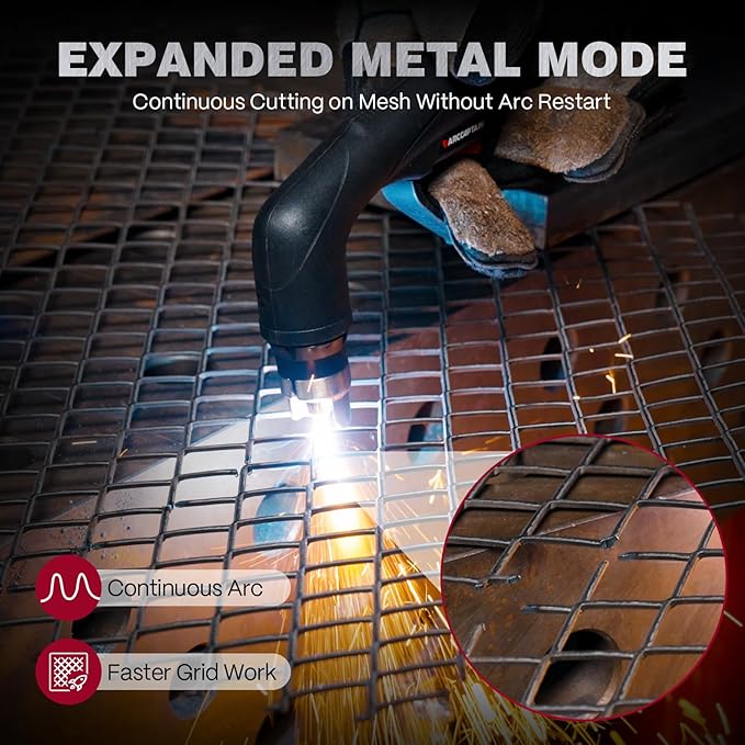 - [MULTI-FUNCTION CUTTING] Supports expanded metal, rust removal, and plasma gouging functions. Expanded metal ensures continuous cutting on mesh or perforated materials. Rust removal enables non-contact cleaning of corrosion or coatings. Plasma gouging levels surfaces and strips paint, ideal for repair and fabrication. (Note: Replace the nozzle when using plasma gouging.)