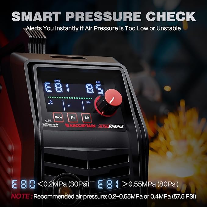 - [REAL-TIME AIR PRESSURE DETECTION] Equipped with a digital air pressure monitoring system that continuously checks incoming air pressure and displays it in real time on the upgraded LED panel. If pressure goes out of optimal range, the system sounds an alert to help prevent undercutting, arc instability, or torch damage, ensuring consistent cuts and longer consumable life. [Recommended pressure: 0.3–0.55 MPa or 0.4 MPa (57.5 PSI)]