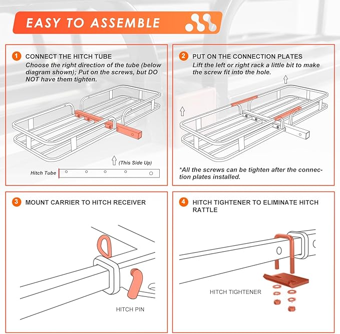 - ACCESSORY INCLUDED - Basket, waterproof cargo bag, hitch stabilizer (Reduce noise and movement while driving), Cargo net with attachment hooks. A pair of ratchet straps.