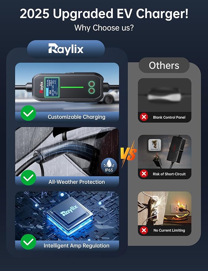 - [Safety & Reliability] Still worried about charging safety? Don't take risks with your EV or your loved ones. Our mobile charger features overvoltage, overcurrent, and overheating protection to ensure safe charging every time. Tested rigorously in Raylix Labs and certified by FCC and CE, it meets the highest standards. With IP66 water and dust resistance, plus a UL94V-0 fire rating, it's built for durability and peace of mind. Choose Raylix for the ultimate in safety and reliability.