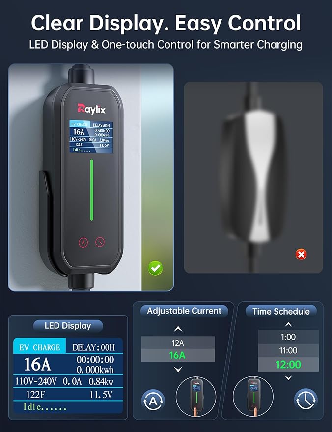 - [User-Friendly Display] Raylix charger for tesla features a convenient built-in display, a unique advantage not found in most other chargers. This screen lets you easily monitor the charging status and current settings at a glance, without having to rely on limited vehicle information or complex apps. Whether you're at home or on the go, you can always stay informed and in control of your charging experience—simple, clear, and user-friendly.