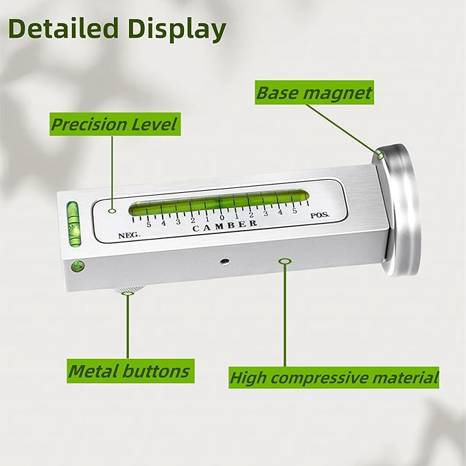 - Premium Material Construction: The camber gauge is crafted from top-grade PC plastic, ensuring robustness and long-lasting performance. It resists oxidation, rust, and corrosion, while boasting high compressive resistance. A powerful magnet is integrated into its base, enabling effortless attachment to a variety of metal surfaces