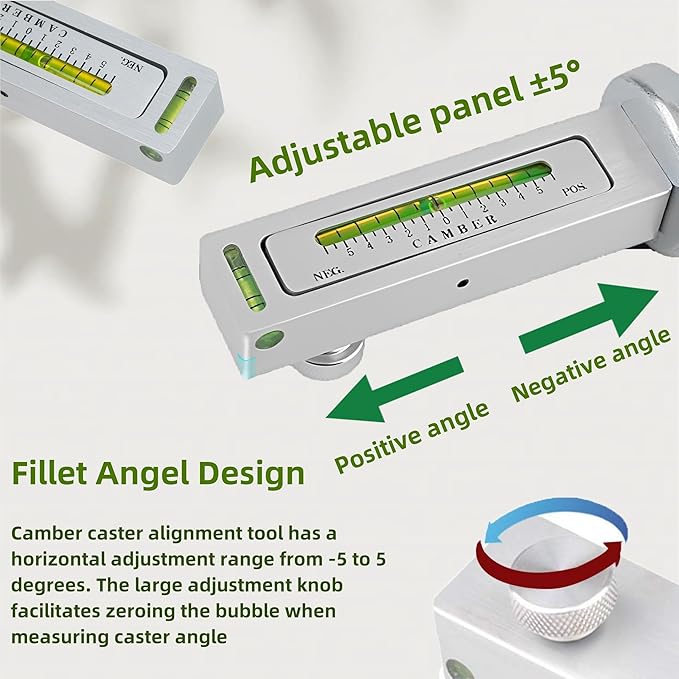 - Expert-Level Measurement: The camber and caster alignment tool boasts a horizontal adjustment span of -5 to 5 degrees. Its oversized adjustment knob makes it easy to zero out the bubble during caster angle measurements