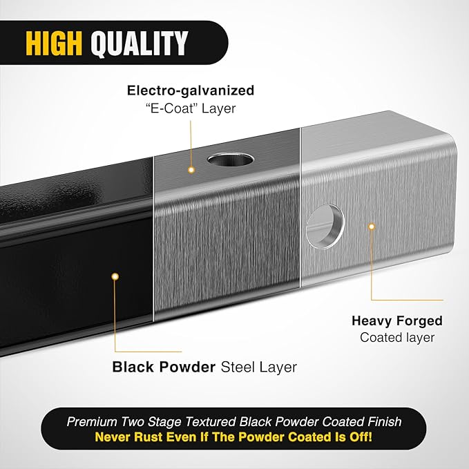 - Corrssion Resistance.Two stage finish using E-Coat pre-coating and high-grade textured black powder coating for long lasting corrosion resistance.