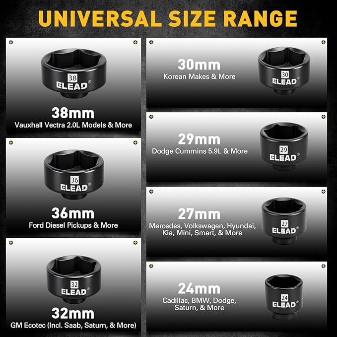 - UNIVERSAL COMPATIBILITY - Fits Toyota, BMW, Honda, Mercedes, and Ford models, covering 7 essential metric sizes (24-38mm) for canister-style filter housings - perfect for DIY oil changes and professional shop use