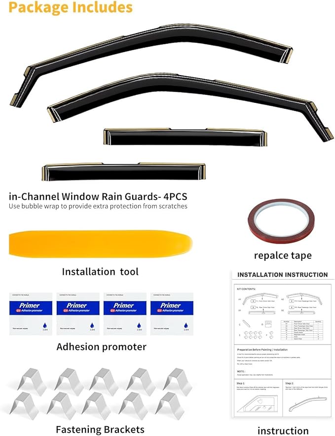 - 【EASY TO INSTALL】There is no drilling or no tools required. If there is a situation where the window cannot be raised due to jamming, please manually adjust the position of the rain guards and close the window for 72 hours to stabilize the position. Reduce the problem of unable to close windows.