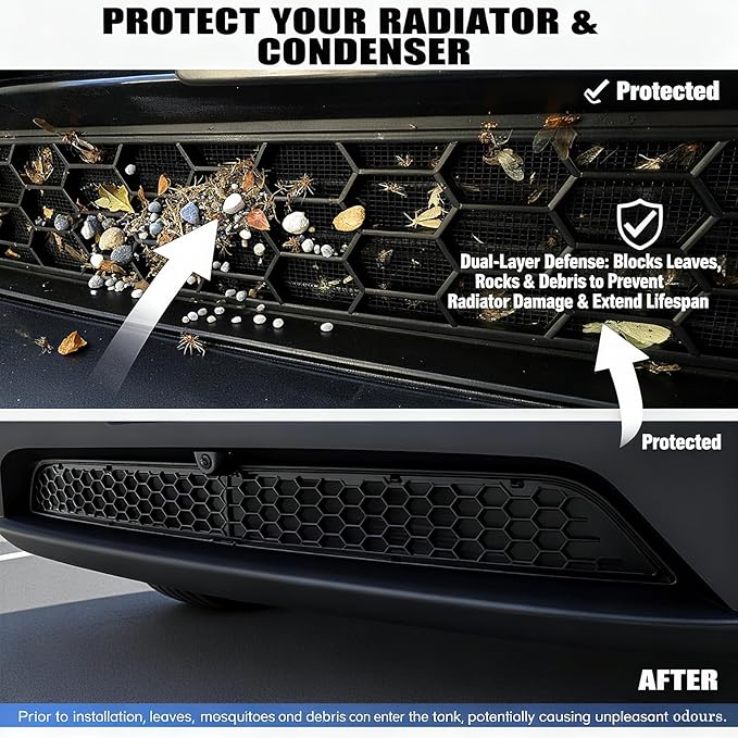 - 2.DOUBLE-LAYERED PROTECTION: Our grill mesh is crafted with rust-proof stainless steel and durable ABS plastic, effectively blocking leaves, rocks, insects, and road debris—keeping your radiator safe from damage and minimizing costly repairs