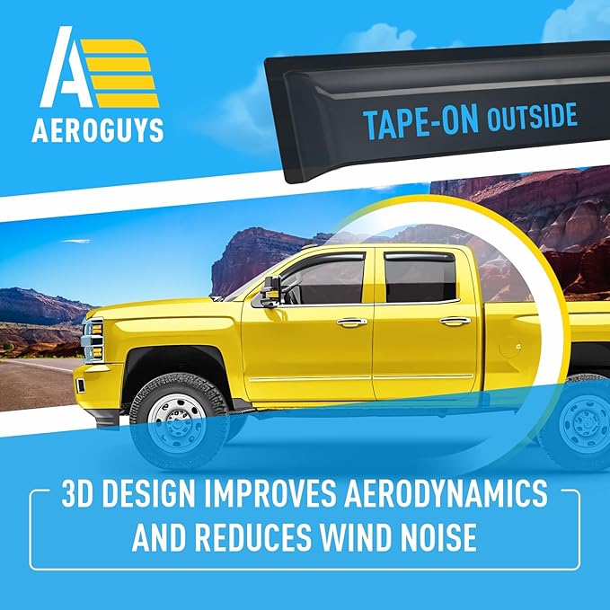 - No Tools Needed, Quick and Easy Assembly – These rain guards are very easy to fit. TAPE-ON INSTALLATION provides perfect fit for your truck. Just slip it onto your car’s window and your job is done within minutes. There is no drilling or no tools required. Be sure that AEROGUYS window deflectors are water resistant, sun protective and will not bend, break or crack regardless of the weather conditions.
