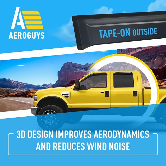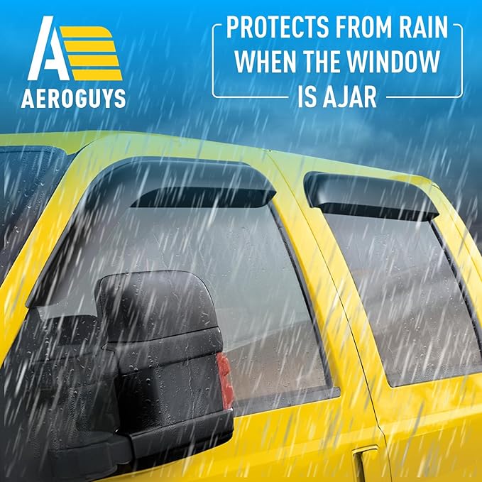 - No Tools Needed, Quick and Easy Assembly – These rain guards are very easy to fit. TAPE-ON INSTALLATION provides perfect fit for your truck. Just slip it onto your car’s window and your job is done within minutes. There is no drilling or no tools required. Be sure that AEROGUYS window deflectors are water resistant, sun protective and will not bend, break or crack regardless of the weather conditions.