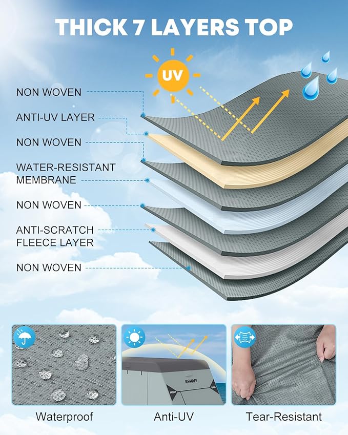 - 7-Layer Thicker Material: Kohree RV cover is made of a 7-layer non-woven fabric material, built with anti-UV, waterproof, anti-scratch layers, protecting your trailer against sun, rain, snow, strong winds, and dust, helping prevent premature wear on your RV and extending the life of the cover