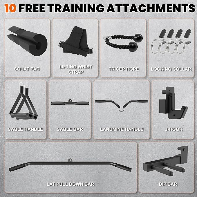 - Complete Premium Attachment Set: Comes equipped with Sandwich J‑Cups, multi‑grip pull‑up bar, safety arms, landmine, lat bar, cable bar, T‑bar row handle, flip‑down pedal, dip bars, 4× plate holders, 2× barbell holders, tricep rope, squat pad, lifting grips and 6× band pegs — everything you need for a pro‑level workout.