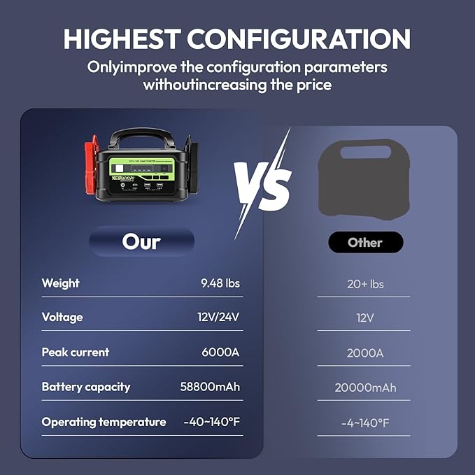 YESPER 12V/24V Jump Starter with 145W Quick Charge, 6000A 218Wh Portable Heavy Duty Truck SuperSafe Battery Jumper Box(Up to All Gas/Diesel), Powerful Car Jump Pack(-40°F to 140°F)