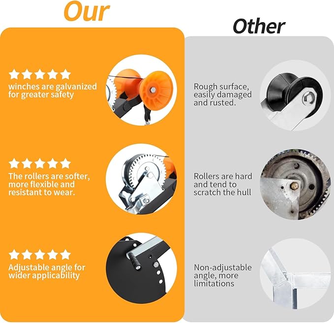 - CORROSION RESISTANCE AND DURABILITY: high strength metal body + rustproof baking paint, resistant to seawater corrosion; polyurethane rollers are wear-resistant and won't hurt the boat, and the life span is much longer than plastic