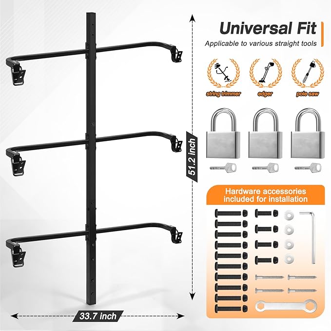 - LOCKABLE TRIMMER RACK - The 3 place lockable trimmer rack features locking holes and an easy snap-in design, with locking devices on both sides for secure fastening and convenient access. Equipped with 3 locks, the hedge trimmer holder can be securely locked in place using our matching locks and deterring theft.