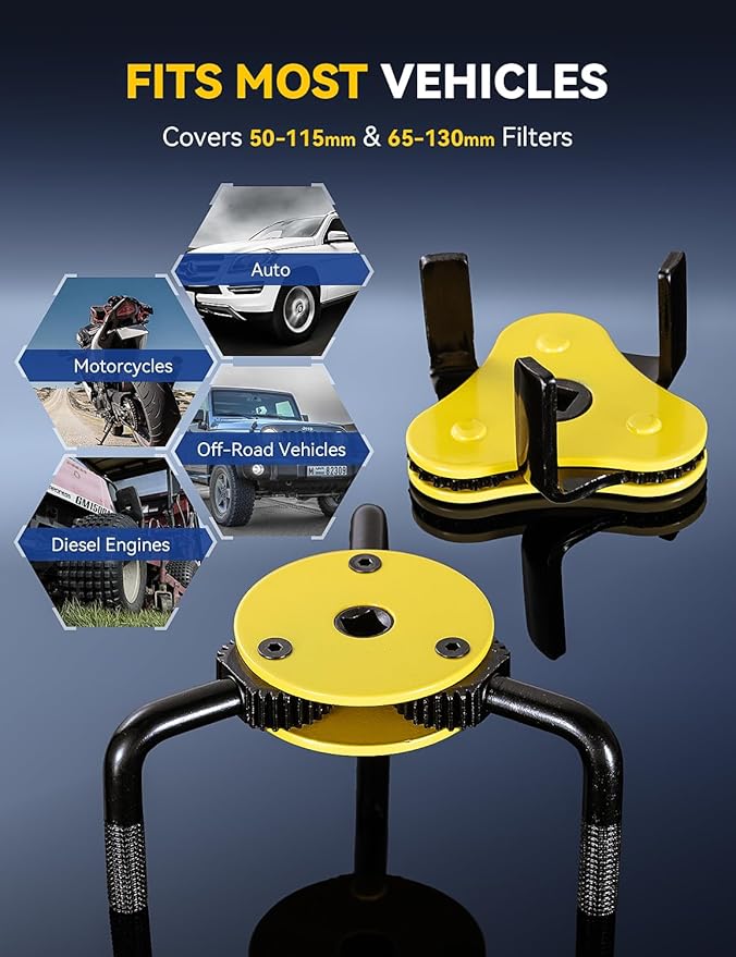 - Fits Most Vehicles: Works on cars, trucks, motorcycles, and diesel engines; Covers 50-115mm and 65-130mm filters for maximum versatility