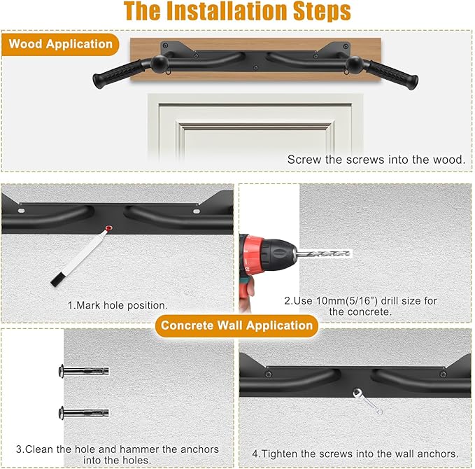 - 🏋️♂️【Easy to Install and Use】The package includes all the hardware you need to install the wall mounted pull up bar. This doorway hanging bar is compatible with both 16-inch and 24-inch wood studs.Just follow the instructions and you can set it up in minutes. The pullup bar is ideal for home gym, garage gym, basement or any other indoor space