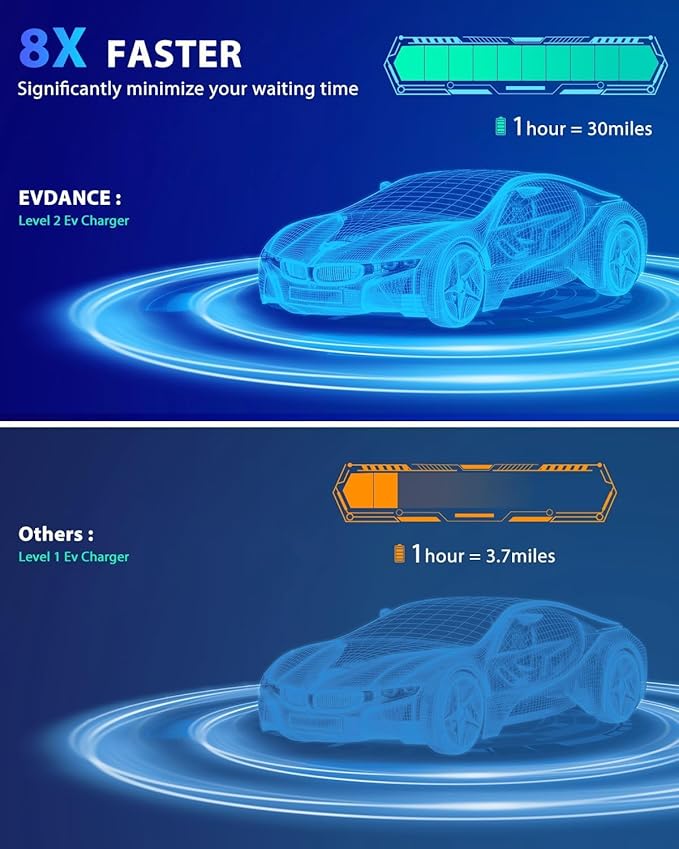 - ✅【Ultra-Fast 9.6kW Charging Speed】- With 40A current and 240V voltage, this Level 2 EV charger delivers up to 9.6kW of charging power, enabling you to charge your electric vehicle up to 6 times faster than standard Level 1 chargers. This ensures that your EV is charged and ready to go in a fraction of the time, giving you more freedom on the road without unnecessary delays.