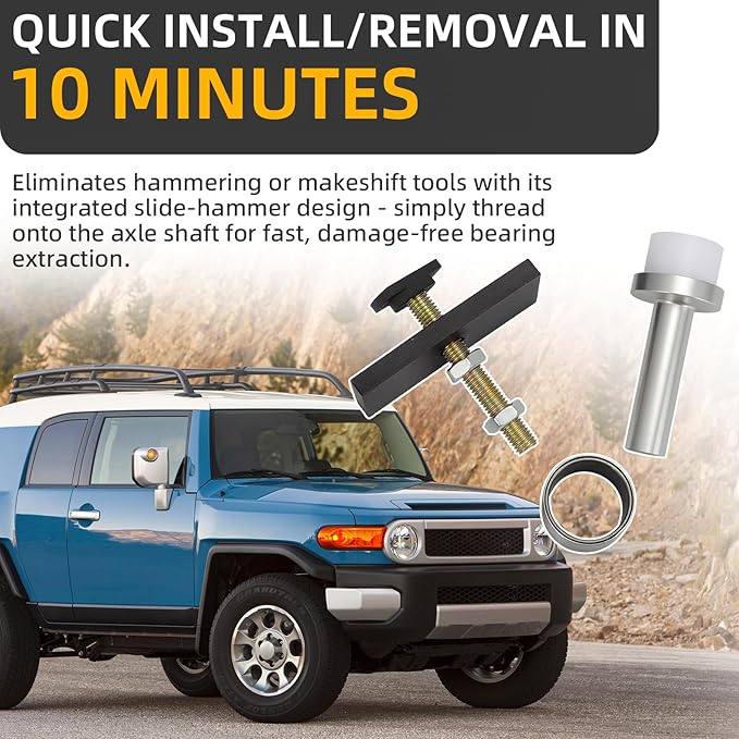 - QUICK INSTALL/REMOVAL IN 10 MINUTES:Eliminates hammering or makeshift tools with its integrated slide-hammer design - simply thread onto the axle shaft for fast, damage-free bearing extraction.