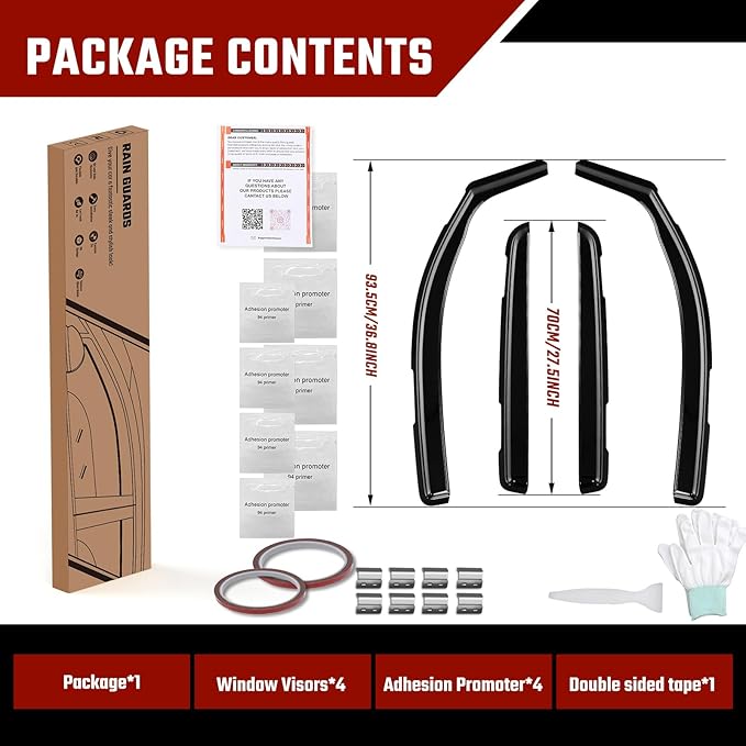- 【Full-Size Side Window Visors】Engineered to fit your vehicle’s year, make, and model, this seamless side window deflector features a contour- hugging design. This 4-piece set includes passenger and driver side window deflectors that create a seamless look that protects you from sun rays, rain drops, and wind while you’re driving with the window down