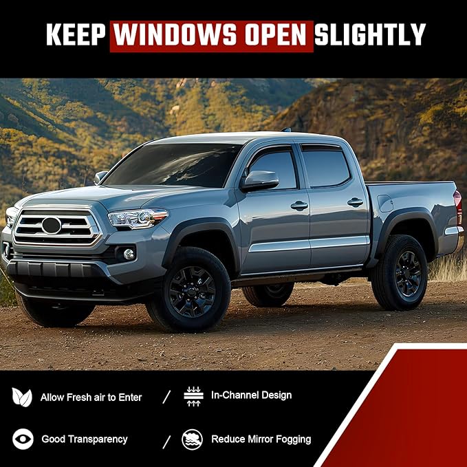 - 【In-Channel Window Deflectors】: ISINLASSO window Visors is perfectly compatible with Toyota Tacoma Double Cab 2016 2017 2018 2019 2020 2021 2022 2023. Note: Please check fitment details in Products Description before placing an order
