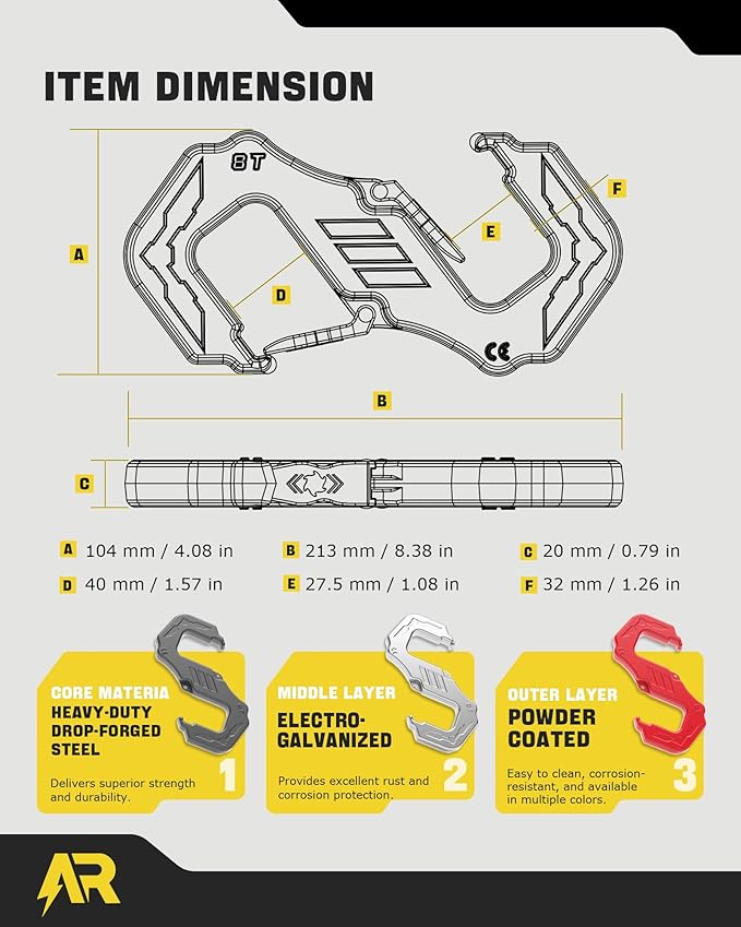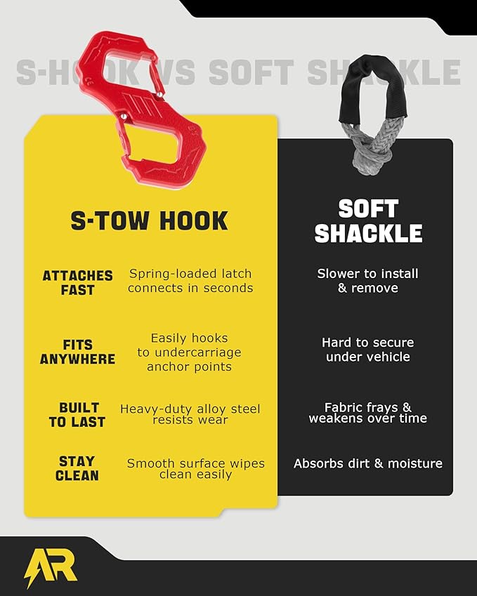 - Multi-Purpose Recovery Solution – The AUTORICH S-tow hook offers versatile functionality in one compact tool. Easily connects to tow straps, extends anchor points, and—unlike traditional connect shackles—features a fast-connection design for instant attachment, saving valuable time during critical recoveries. Dual-opening hooks provide greater flexibility, enabling more creative and efficient recovery setups in challenging situations
