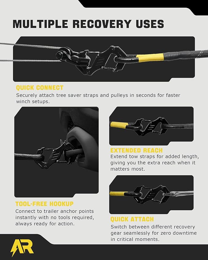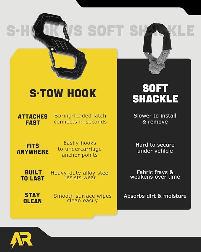 - Multi-Purpose Recovery Solution – The AUTORICH S-tow hook offers versatile functionality in one compact tool. Easily connects to tow straps, extends anchor points, and—unlike traditional connect shackles—features a fast-connection design for instant attachment, saving valuable time during critical recoveries. Dual-opening hooks provide greater flexibility, enabling more creative and efficient recovery setups in challenging situations