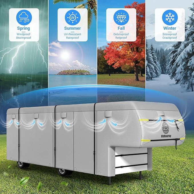 - 【Full-Season Exterior Protection】No matter the forecast, this fifth wheel cover defends your RV from UV damage, rain streaks, leaf stains, dust storms, and more. Ideal for fifth wheel trailer owners seeking long-lasting surface protection and a cleaner exterior during storage.