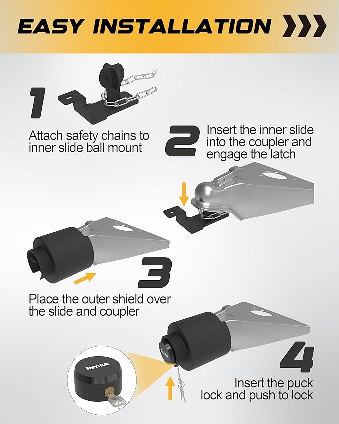 - Quick & Easy Installation The RETRUE trailer coupler lock is designed for hassle-free installation and removal. With its intuitive design, you can secure your trailer quickly without complicated steps, saving you time and effort.