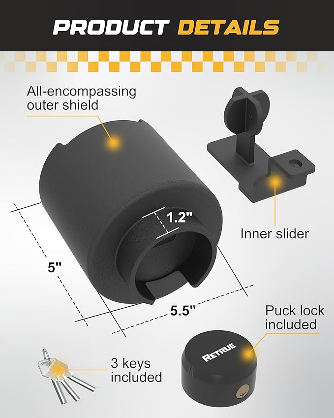 - Precision Fit for 2-5/16” Couplers Exclusively designed for 2-5/16” couplers, the RETRUE trailer lock offers a snug, tamper-proof fit, preventing any gaps that could be exploited by thieves. Always check your coupler size before purchase to ensure compatibility.