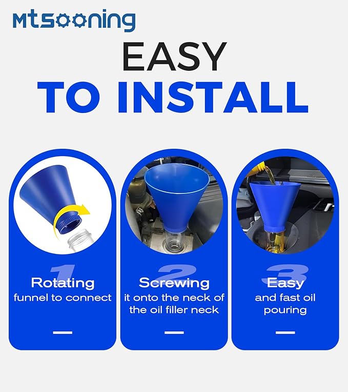 - [Easy to Use]:Simply remove the original oil cap and firmly connect the funnel to the oil neck,then start adding engine oil.The upper and lower threaded connection is sealed to prevent oil overflow and ensure that every drop of oil is fully utilized