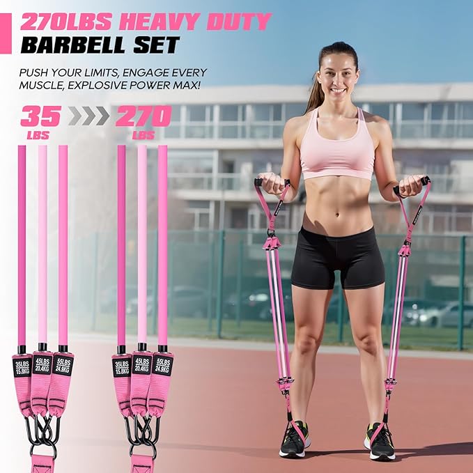 - Up to 270LBS Progressive Resistance & Natural Latex Bands: This pilates bar set includes 6 premium natural latex resistance tubes (2x35lb, 2x45lb, 2x55lb), delivering up to 270lbs total resistance. Engineered for high elasticity and exceptional tear resistance, they provide safe, durable progressive training suitable for all levels, from beginners to advanced users.