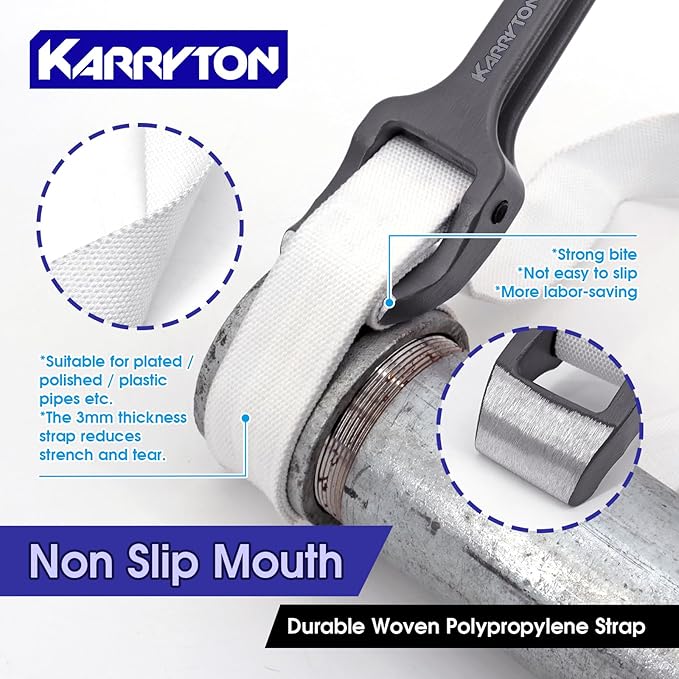 - 48-INCH EXTRA-LONG NYLON STRAP – KARRYTON 18-inch strap wrench engineered with a 48-inch long and 1.75-inch wide industrial-grade nylon strap for superior grip strength on large pipes, oil filters, and irregular objects (up to 12-inch diameter).