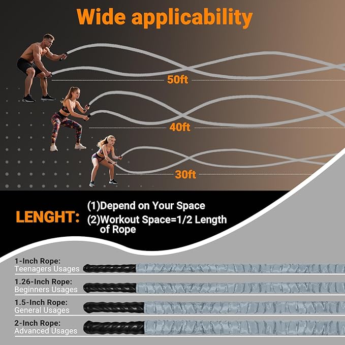 - Suitable For All Levels And Can Be Used For Different Training Purposes: Exercise rope has three thicknesses of 1.26 inches, 1.5 inches, and 2 inches, with a length of 30 feet. The 1.26"-30FT one weighs 9.5 pounds, which is suitable for beginners to conduct daily exercises at home; the 1.5"-30FT one weighs 14.5 pounds, suitable for intermediate - to - advanced professional fitness enthusiasts; the 2"-30FT one weighs 23.5 pounds, suitable for advanced professional fitness people.