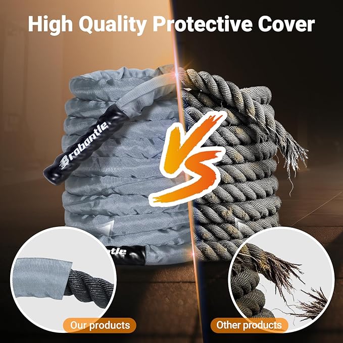 - Ultra-durable Structured Professional Battle Rope: The battle rope is made of durable three-strand 100% polyester filament material. A nylon protective cover is added on the outer layer. The high-tensile-strength exercise rope can prevent breakage, wear, or loosening, and is more durable than other exercise ropes without protective covers. This is a good choice for fitness enthusiasts for workouts in home gyms and outdoors.