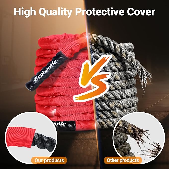- Ultra-durable Structured Professional Battle Rope: The battle rope is made of durable three-strand polyester filament material. A nylon protective cover is added on the outer layer. The high-tensile-strength exercise rope can prevent breakage, wear, or loosening, and is more durable than other exercise ropes without protective covers. This is an ideal choice for fitness enthusiasts for workouts in home gyms and outdoors.