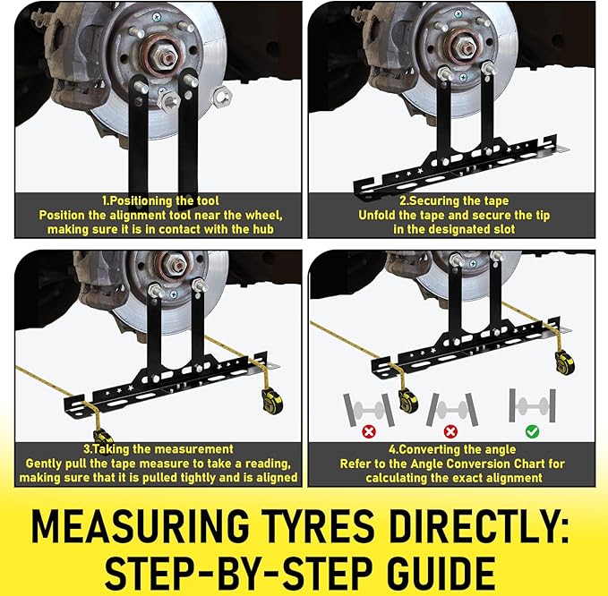 - Comprehensive Kit: Includes 2 measuring brackets, 2 tape measures, 1 screw wrench, 1 hexagonal wrench, providing a complete wheel alignment solution for all types of vehicles