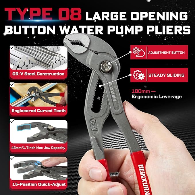 - 2PCS 7” Groove Pliers: these two joint pliers up to 1-2/5" jaw capacity, fit comfortably around all sizes and shapes of fasteners and materials