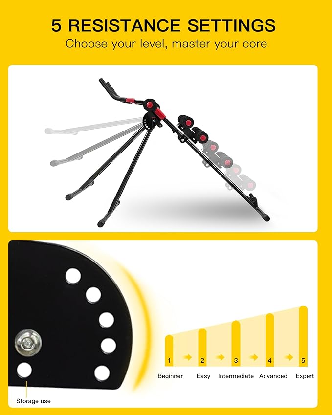 - Adjustable Resistance: Ab workout machine offers 5 resistance levels and multiple height settings, letting you personalize your workout intensity. Whether you’re a beginner or advanced user, easily increase difficulty to target abs, thighs, and arms efficiently, helping you progress and maximize fat burning at home.