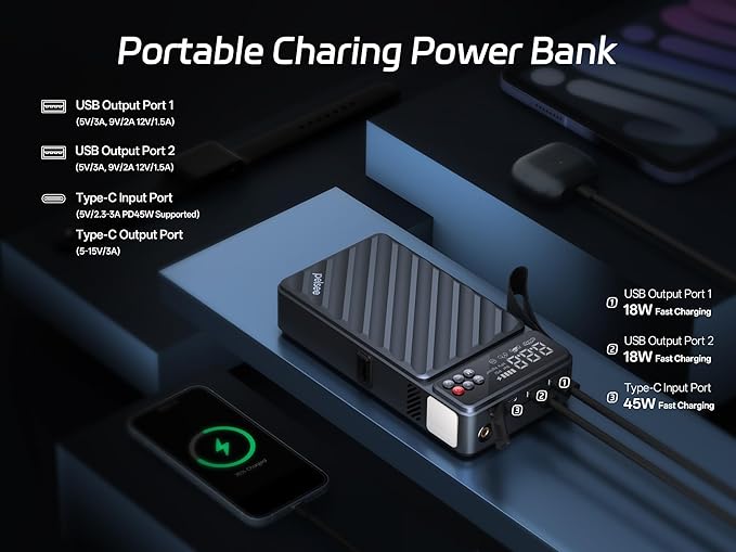 - 45W Fast Charge & 12 Safety Protections- Equipped with two output ports-18W (Type-C Input Port for 45W fast charging), Portable car battery jump starter can charge various electronic devices efficiently. 12 safety protection (Spark protection,reverse polarity etc)and multiple safety warnings provide greater security for your journey (Note: When the internal temperature reaches 95℃ during inflation, it will enter overheat protection and shut down. Please wait for it to cool down before continuing to use it)