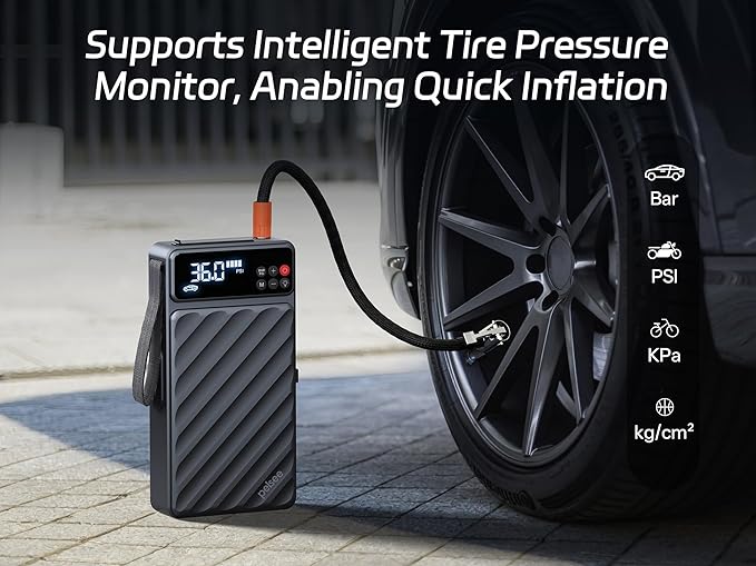 - Jump Starter with Air Compressor- Equipped with high-efficiency turbocharger system. Supports intelligent tire pressure monitor, automatically detecting tire pressure from 0-51 PSI and enabling quick inflation. Equipped with 4 inflation modes(Bar,PSI,KPa,kg/cm²), making quick work of insufficient tire pressure