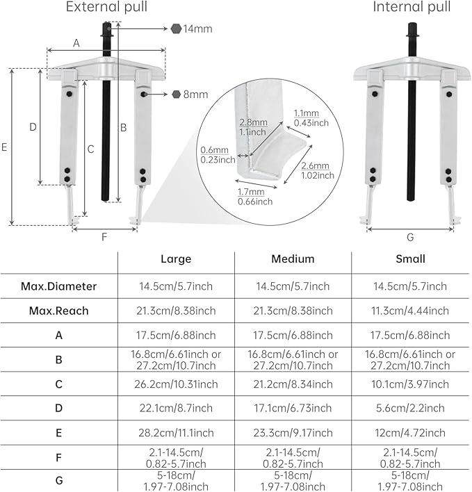 - Adjustable & Confined-Space Ready: The puller features adjustable clamping width and extended hooks, allowing secure gripping of bearings, gears, pulleys, and flywheels in tight or confined spaces without damage.