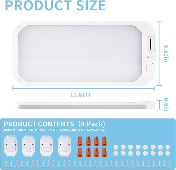- TWO CONTROL MODES: Ultimate control for your RV lights! Use touch buttons or the upgraded remote (33ft range). Easily turn camper lights on/off, switch temps, cycle brightness (20%-100%). Smart memory recalls your last setting – no resetting! Essential for convenient RV light fixtures operation. Simplifies managing your RV LED lights