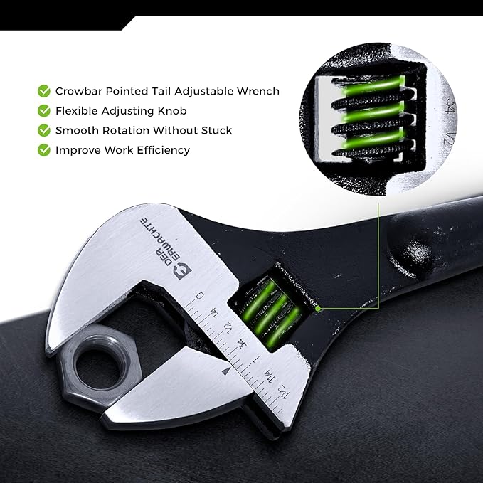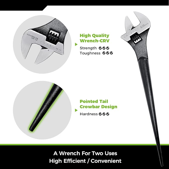 - ADJUSTABLE JAWS: Wide-opening adjustable wrench heads accommodate various fastener sizes for maximum versatility on the job