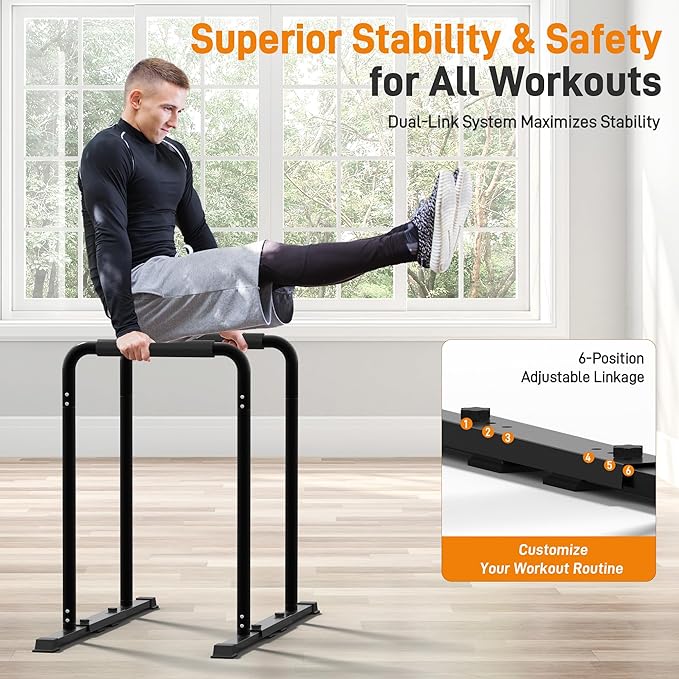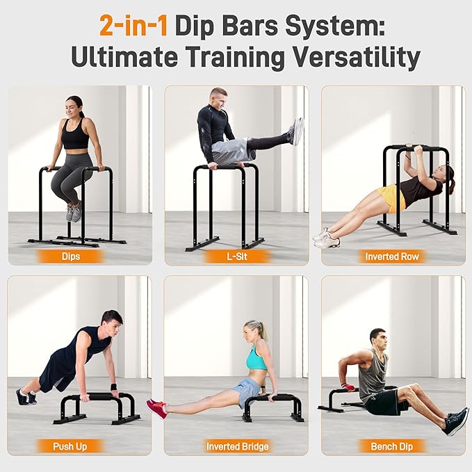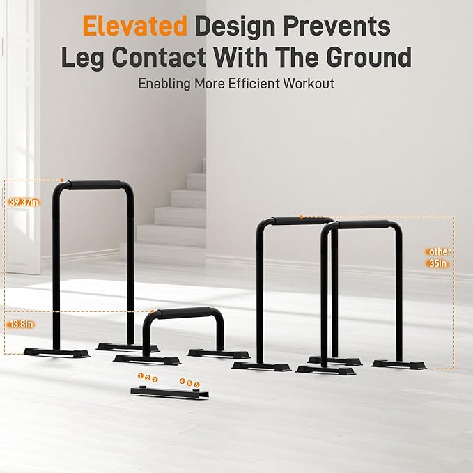 - 【Reinforced & Elevated Design】These dip bars feature an increased height, allowing you to exercise without worrying about your feet touching the ground—significantly boosting workout efficiency. Constructed with 3mm-thick steel tubes, they maintain exceptional stability despite the added elevation. Designed for users of all body types and strength levels, they ensure long-term durability with no concerns over wear or structural failure.