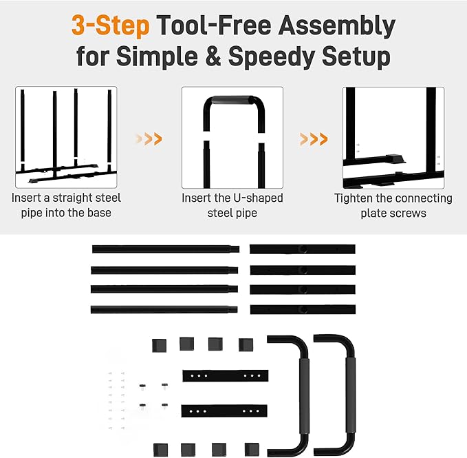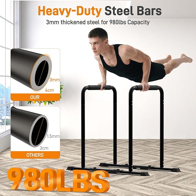 - 【Ultra-Stable and Heavy-Duty Structure】Crafted from alloy steel for exceptional durability, this parallel bars set can support up to 980 lbs and features 2 ultra-stable connecting components to eliminate wobbling or tipping during intense workouts.