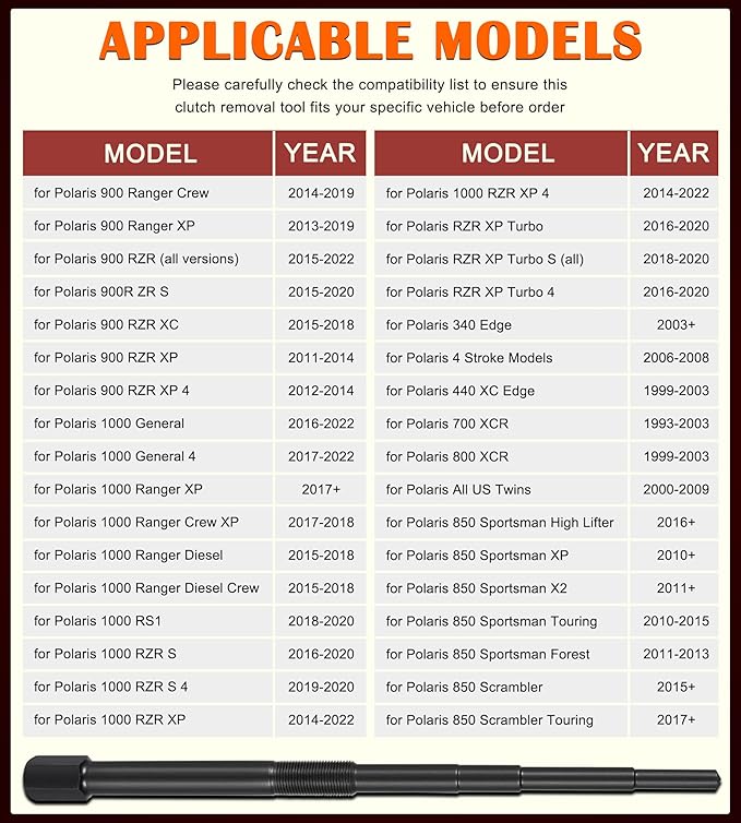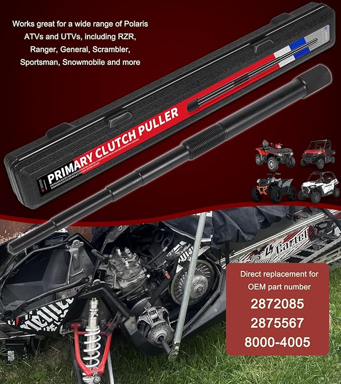 - 【Perfect Fitment】This clutch puller tool compatible with most Polaris ATV and UTV models - fits for 1999-2020 Polaris Ranger 900/1000 RZR/Snowmobile; fits for Polaris Side x Side and Snowmobile; Fits for most Polaris UTV’s Ranger, RZR, XP, EPS, LE, 900, Crew models from 2011- UP, etc. See Details Fitments in the Image #3. (Notes: Please confirm whether your vehicle model is compatible with the clutch puller before purchase.)