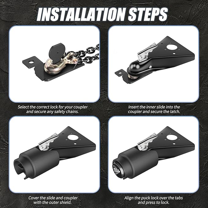 - 1-Second Lock & Unlock with Unbreakable Keys :Patented push-button puck lock secures your coupler instantly—ideal for rushed stops. Three drill-resistant keys (anti-pick grooves + hardened pins) ensure quick, theft-proof access. Perfect for job sites, storage yards, or chaotic docks.