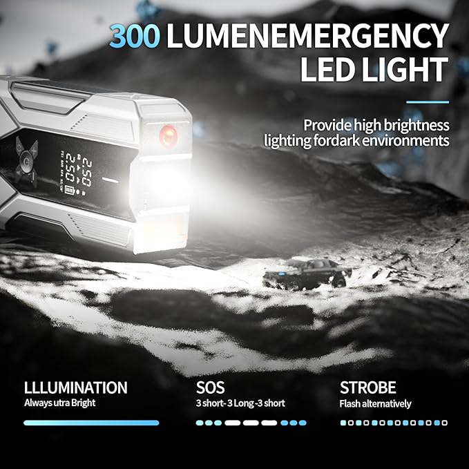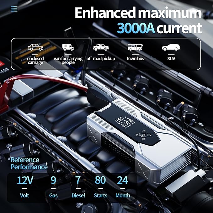 - 【Powerful Dead Battery Rescue】:Instantly restart vehicles with our high-output 3000A peak portable car jump starter. Safely jump gasoline engines up to 9L and diesel engines up to 7L in seconds, even with completely dead batteries. Get back on the road fast, no waiting for roadside assistance.