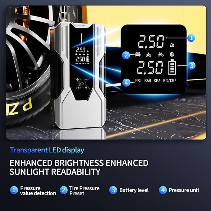 - 【Integrated 150PSI Tire Inflator】: Rapidly inflate car tires, bikes, sports balls, and more with the built-in digital air compressor. Easily set your desired pressure (PSI/BAR/KPA) on the clear LCD screen; it auto-shuts off when reached. Tackle low tires anytime, anywhere.